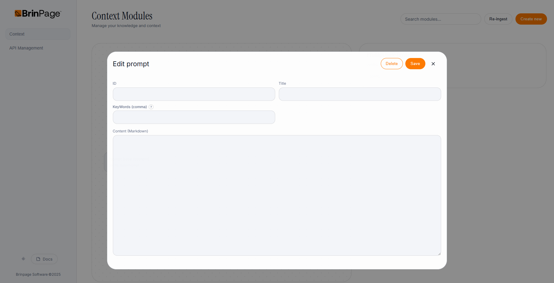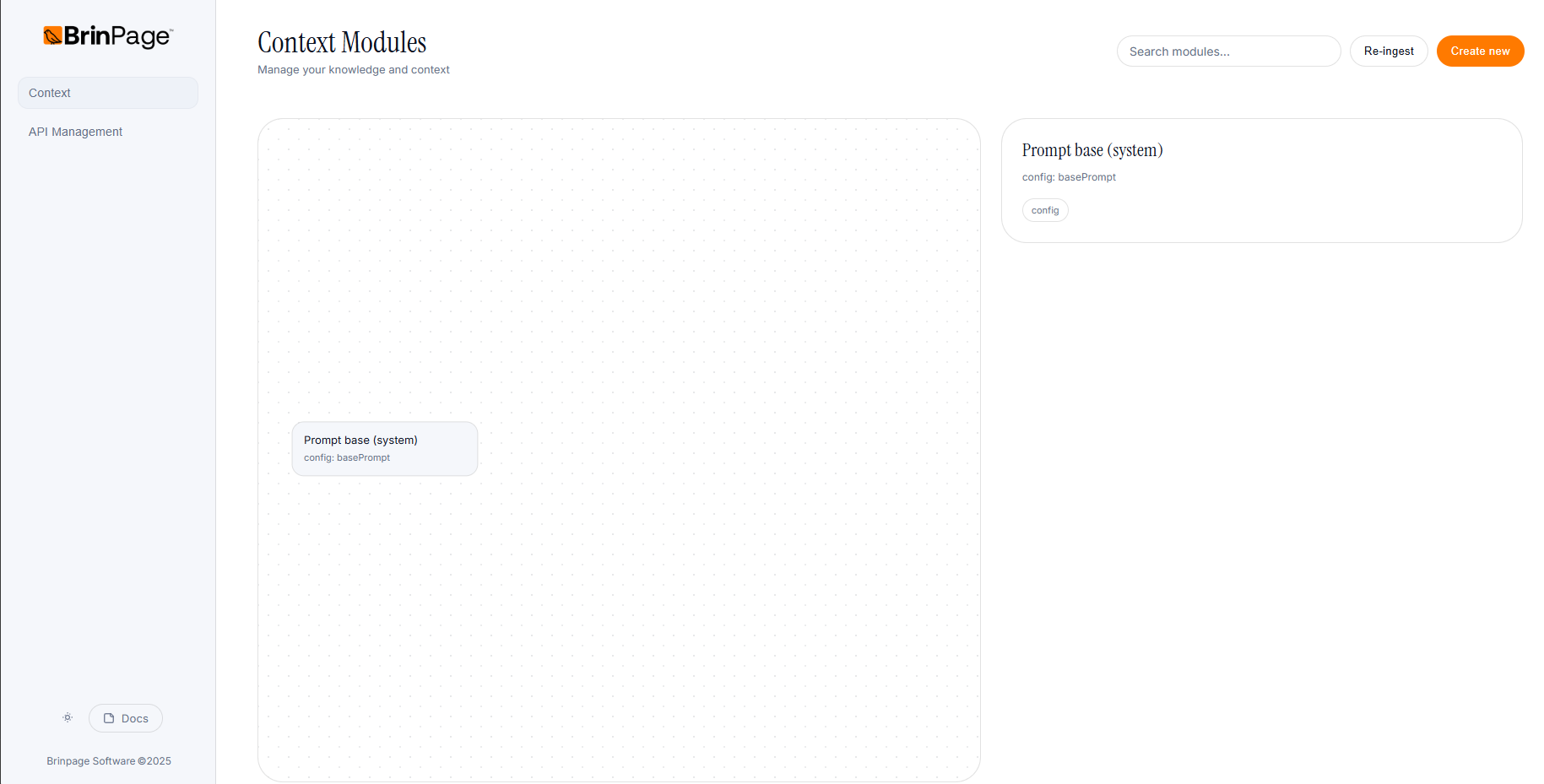 Once CPM is installed and connected to your BrinPage Platform account, the dashboard becomes your control panel for how your AI behaves. You will mainly work with two areas: Context Modules and API Management.