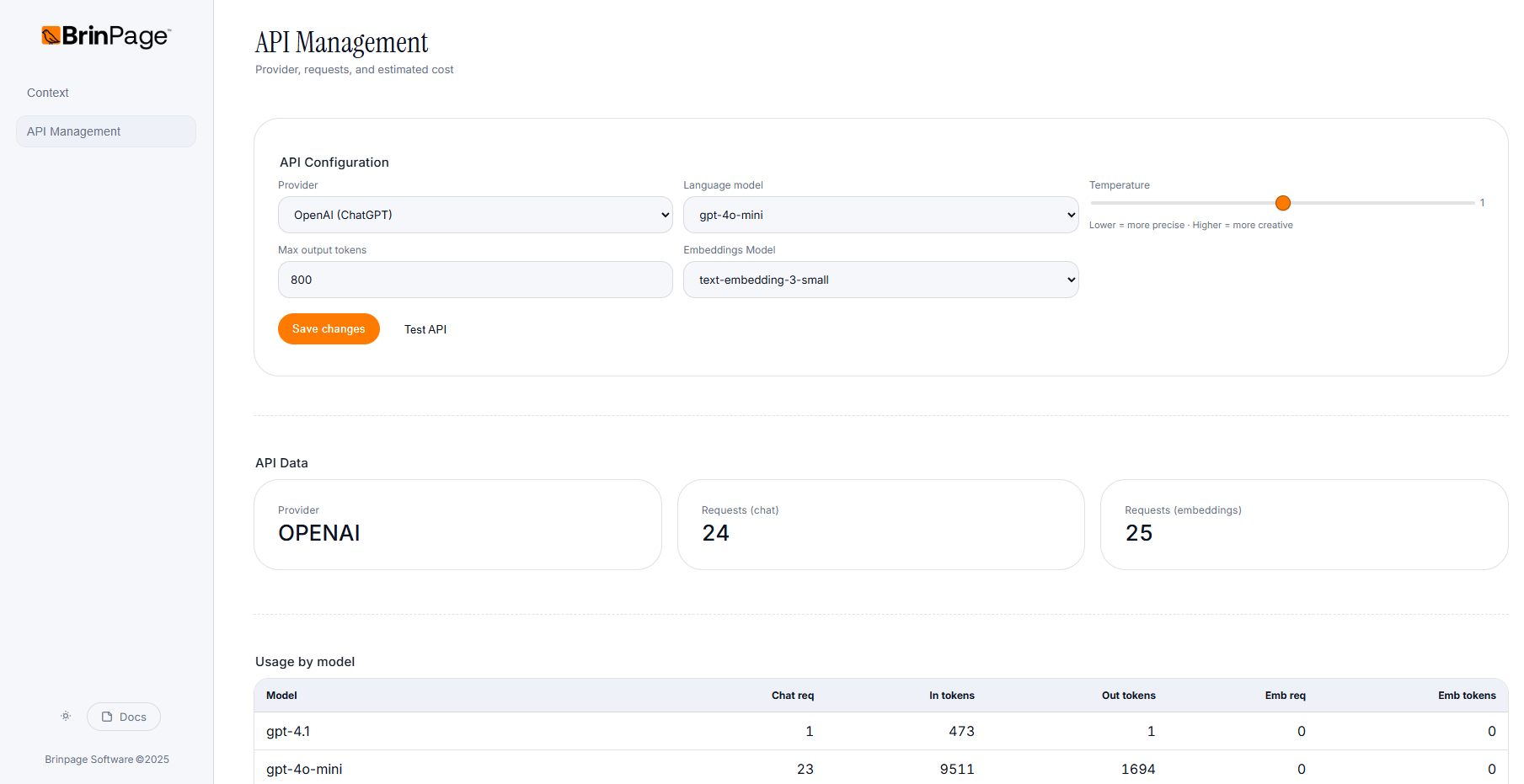 - API Management – where you configure your provider (e.g. OpenAI), choose language and embedding models, set temperature, and review usage metrics.